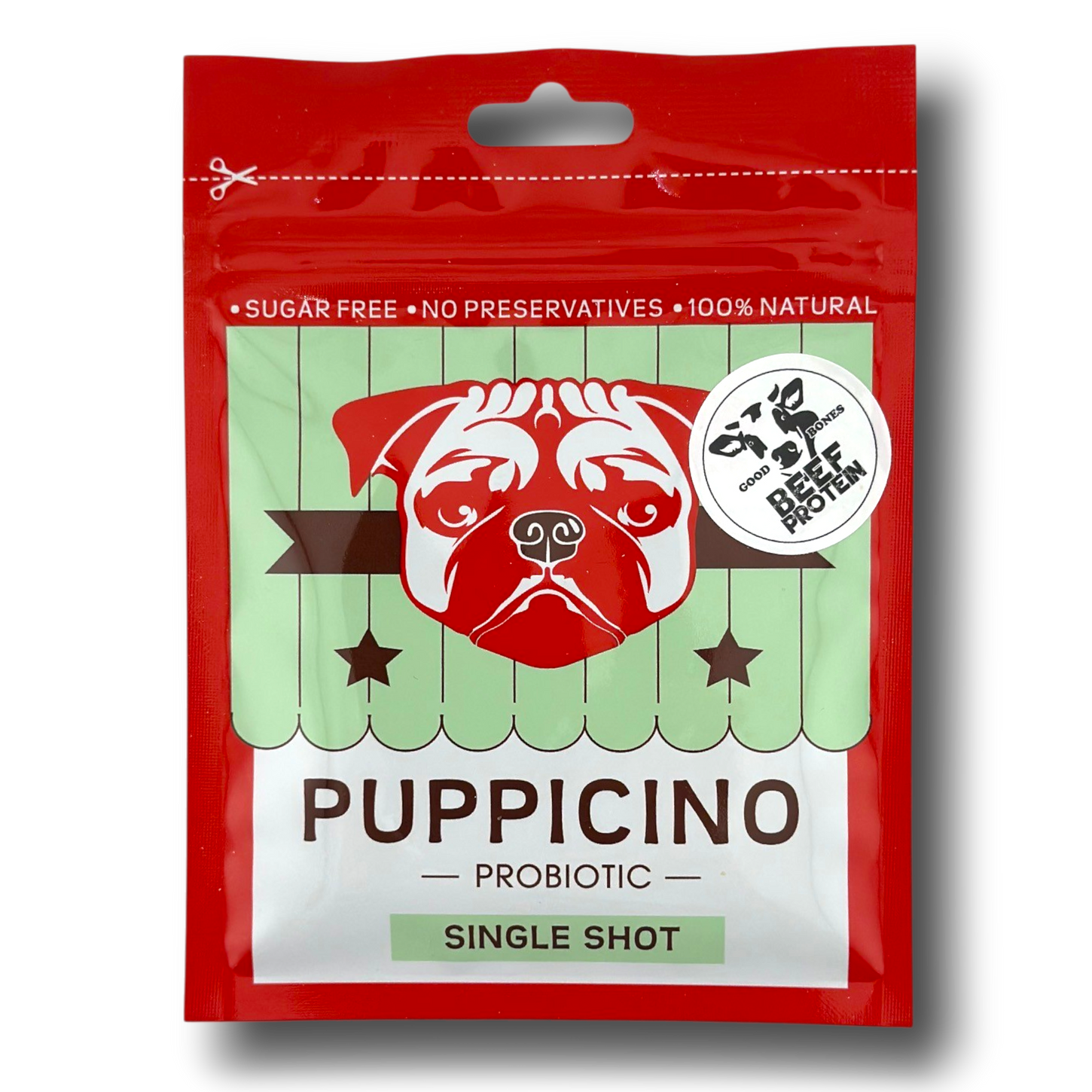 Original puppicino with added beef. Beef is a rich source of high-quality protein that helps build and maintain strong muscles. It also contains important nutrients like iron, zinc, and B vitamins, which support energy, a healthy immune system, and red blood cell production. Beef also provides healthy fats that help keep a dog’s skin and coat healthy. 🐶