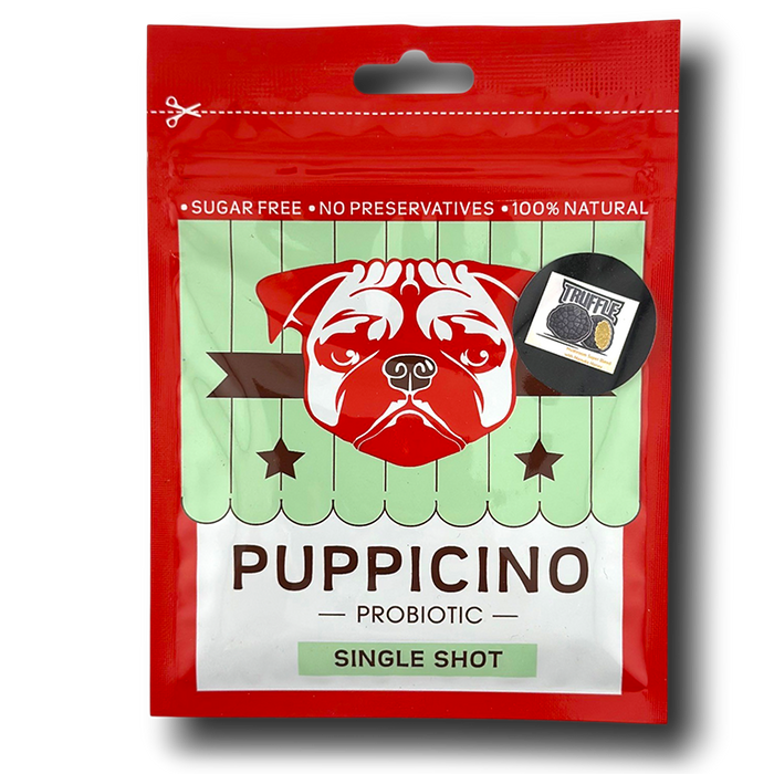 The original puppicino and all flavours are available in a 40 serve bag.