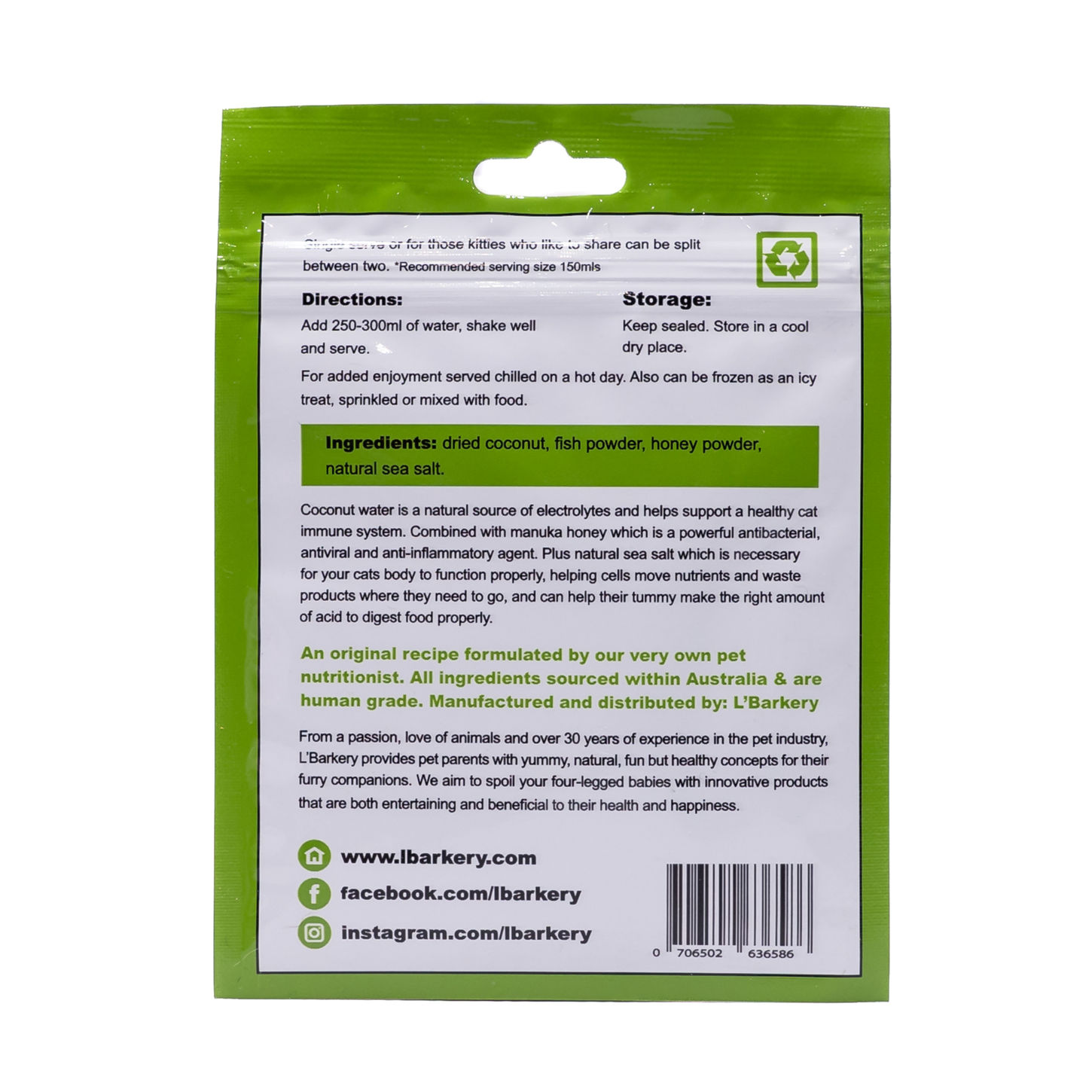 A refreshing, all-natural pet beverage made with no preservatives, no added sugars, and 100% human-grade ingredients. Perfect for hydrating, nourishing, and pampering your dog or cat with a tasty, nutrient-rich pawtail made for . Ingredients & Benefits 🥥 Coconut: Natural electrolytes for hydration, immune support, and overall vitality. Naturally antibacterial and antifungal, promoting healthy skin and a shiny coat. 🍉 Watermelon: Packed with vitamins and minerals, a great source of electrolytes for rehydration. Supports heart and cardiovascular health, while delivering a light, refreshing taste pets love. 🧂 Magnesium: Supports healthy muscle contraction and relaxation, aids muscle regeneration, and contributes to optimal organ function. Studies also suggest magnesium helps emotional wellbeing and calmness in pets. Additionally, magnesium promotes strong bones and teeth and may help prevent illnesses. Pack Sizes - Single Sachet - 20-Serve Tub - 40-Serve Bag Simply mix with water to create a hydrating, nutrient-rich drink your furry friend will adore—perfect served chilled or over meals for extra fun. Directions for Use Add 150ml of water, shake well, and serve. For extra enjoyment: - Serve chilled - Freeze for a refreshing icy treat - Pour over kibble for a flavourful meal booster
