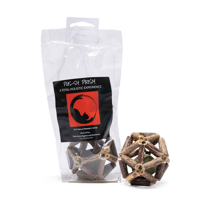 Turn playtime into a stimulating adventure with PUS-SY PRISMS, a cage-style cat toy crafted from natural Matatabi (Silvervine) and featuring an irresistible catnip ball inside. Available in single or double packs, this interactive toy keeps your cat engaged, active, and mentally enriched. Why Cats Love It: 🌿 Matatabi Cage Ball: Naturally stimulates and excites cats, promoting playful behaviour. ⚽ Catnip Core: The catnip ball inside adds an irresistible aroma that encourages batting, chasing, and pawing. 😺 Interactive Fun: The cage design lets the ball roll and wobble unpredictably, keeping cats entertained for longer. Health & Wellness Benefits: 🦷 Supports Dental Health: Chewing on the Matatabi gently helps reduce plaque and tartar. 🐾 Mental Stimulation: Encourages problem-solving and active play, helping prevent boredom. 😌 Stress Relief: Natural Matatabi and catnip provide calming, enjoyable enrichment. Available in single or double packs, PUS-SY PRISMS is perfect for solo or double the fun, keeping your feline friend happy, healthy, and playfully engaged.